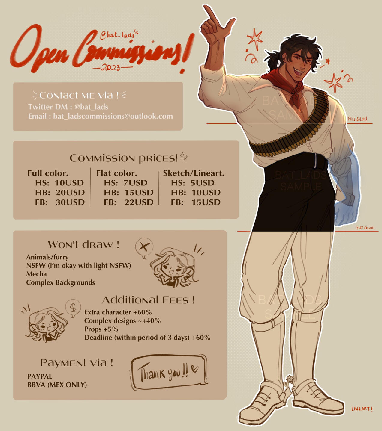 ✺ I reserve the right to reject a commission if I feel uncomfortable about it.✺ I'll start working on your commission once the total amount of payment is received.✺ It takes from 1 to 4 weeks to complete a piece; a deadline can be discussed if necessary.✺ you're entitled to 1 to 3 sketches to request as many changes as you want; once the sketch is approved, there will be no changes.✺ Commissions are for personal/non-commercial use only; my art cannot be sold for monetary gain.✺ refunds are not available; Orders can only be cancelled prior to the commission being started ( first sketch sent for approval).